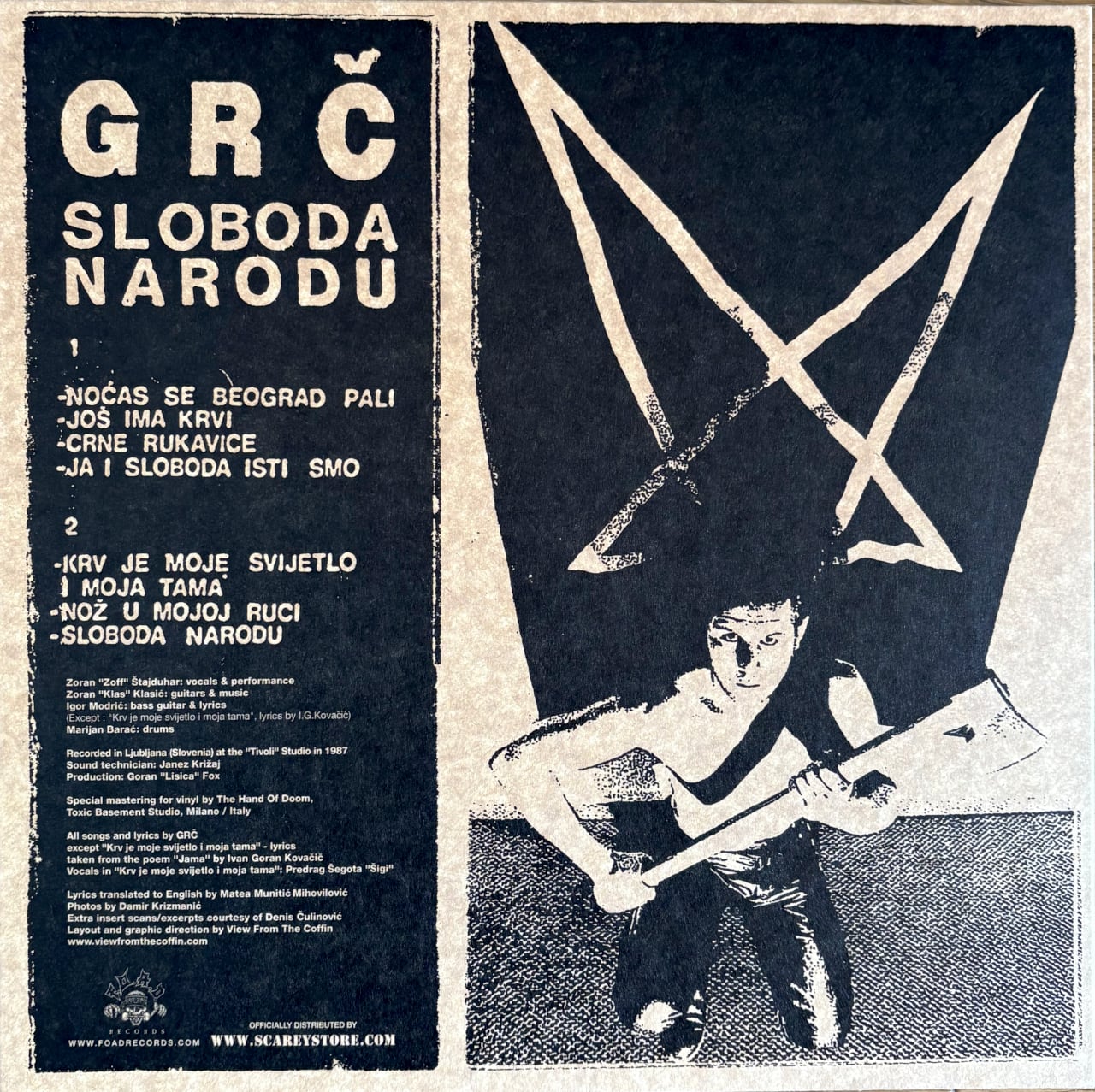 By popular demand, we’re glad to announce a new pressing of this highly acclaimed gem from the 80’s Yugoslavian underground!! GRČ formed in 1982 in the prolific punk/dark/new wave scene of Rijeka, Croatia. Their album “Sloboda narodu”, originally released in 1987 on cassette only, represents one of the most gloomy and hopeless expressions of negativity that any genre labeled as dark, death-rock, or post-punk has ever conceived. It exudes blood, secular darkness, and anguish in its purest form. Their musical approach is a solid blend of doom tinged post-industrial rock and uncompromising dark punk atmospheres. The incredible downtuned voice of their ominous frontman Zoff consolidates a feeling of solemn black decadence that goes hand in hand with wonderful lyrics, a desperate cry for freedom in a landscape of war, urban decay, and social oppression. Remastered from the original 1/4″ reels, packaged in a reverse board avana jacket with an 8-page booklet featuring rare photos, flyers and lyrics (also translated in English).
