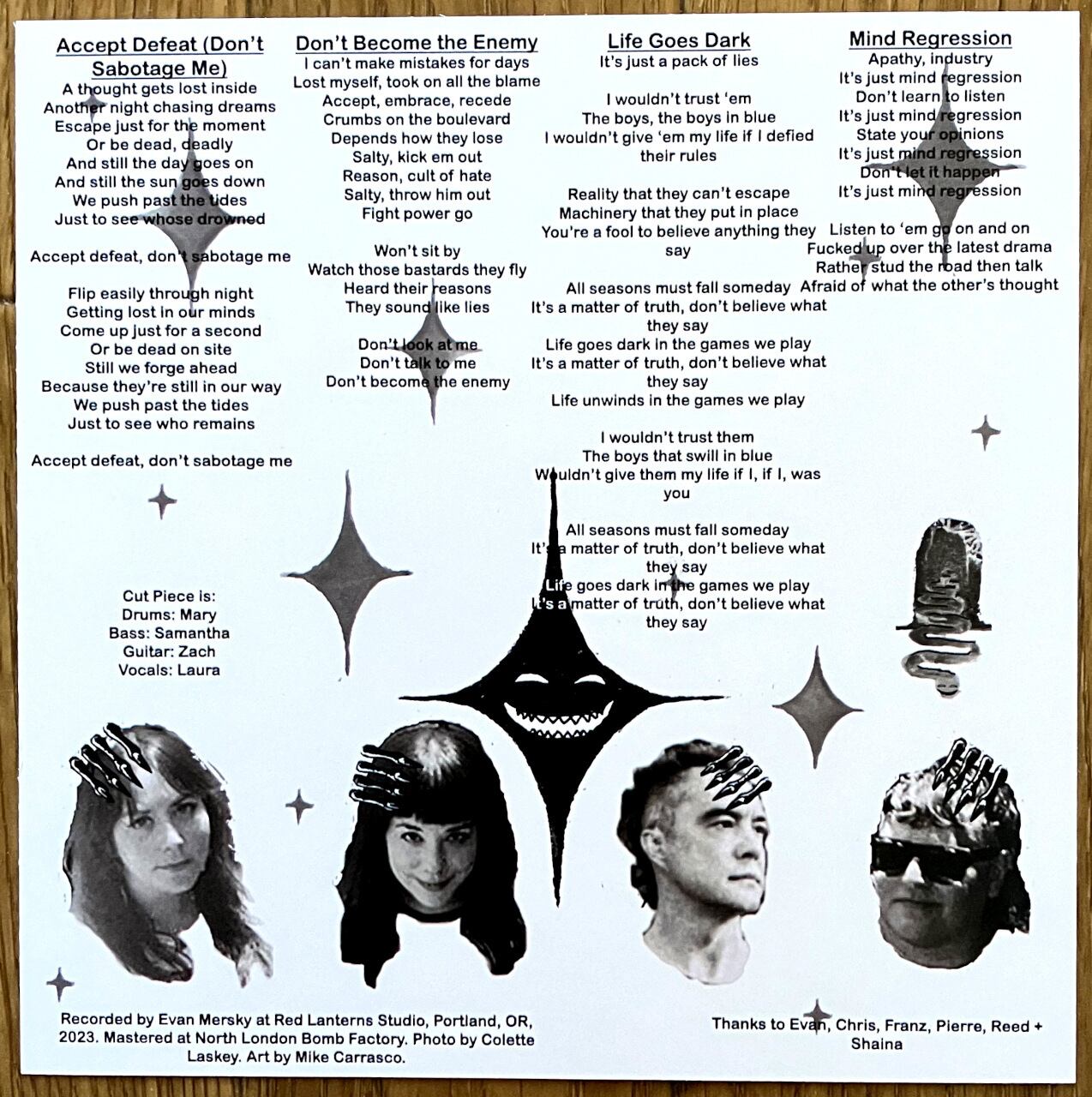 Punk / Hardcore band with female vocals from Portland, US, featuring members of PISS TEST, RED DONS, MACHO BOYS, PETITE, APRIORI, DIALS, SALTED CITY, WHISPER HISS, SLEEPWALKERS and more. The first 7" with 4 tracks by CUT PIECE!